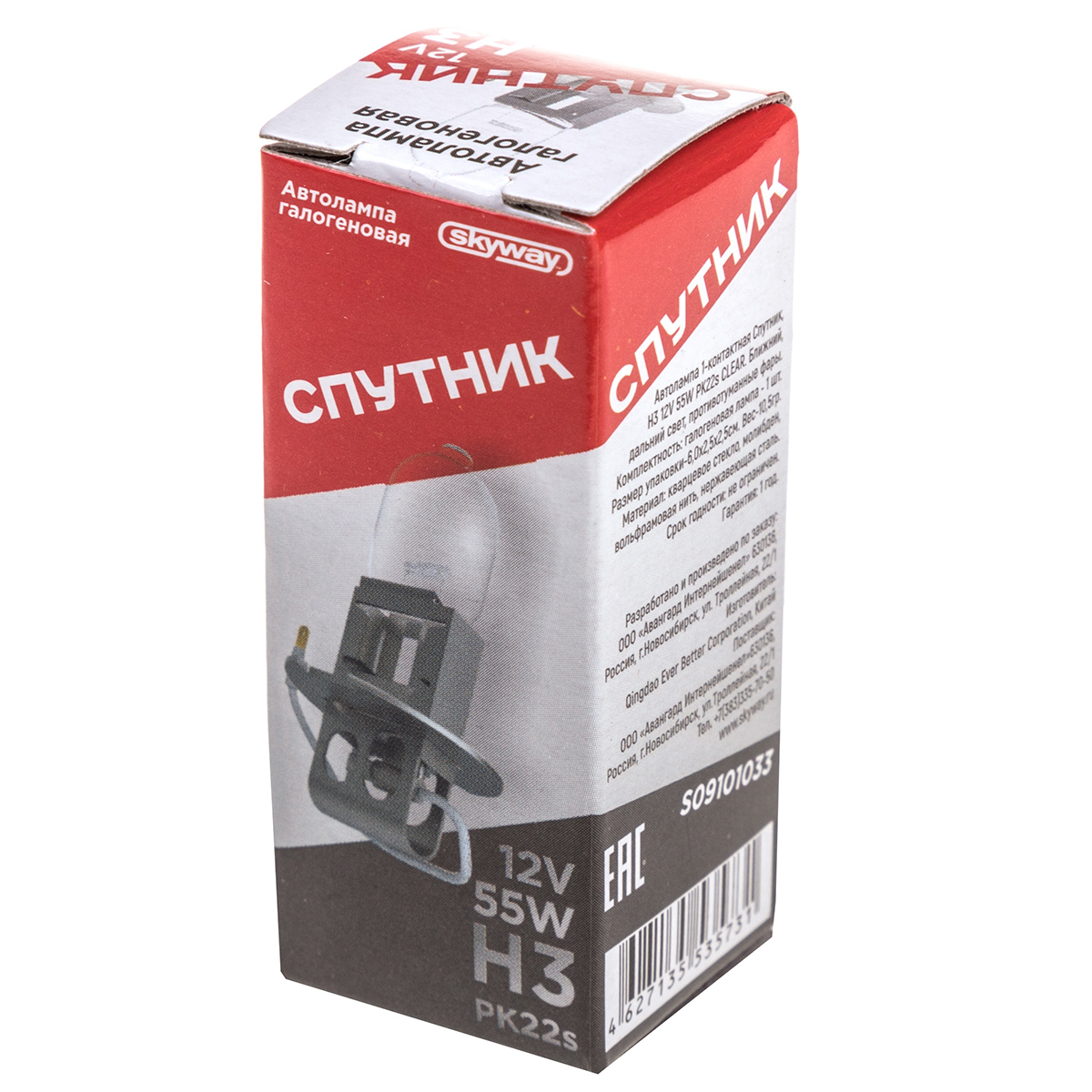 Автолампа H3 12V СПУТНИК SKYWAY - автолампа Н3-одна из самых популярных автомобильных ламп, используемых в большинстве автомобилей. Цоколь H3 обычно используется в противотуманных фарах и в фарах ближнего света.