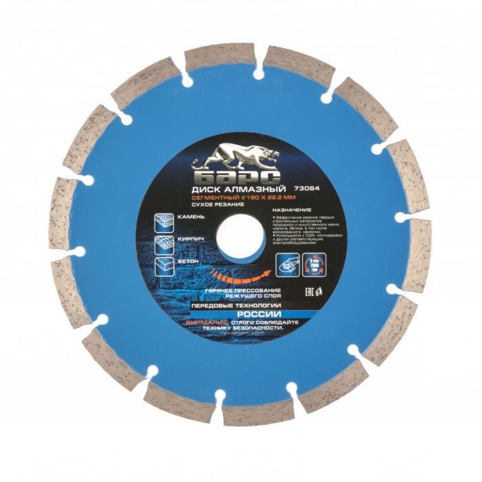Диск алмазный, сегментный 180х22,2 мм, сухая резка Барс 73064, описание: