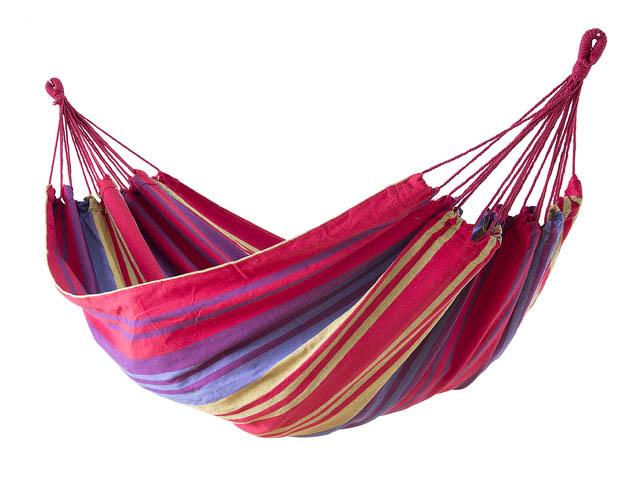 Подвесной гамак - это гарантия отличного времяпровождения на свежем воздухе. В тканевом гамаке можно уютно расположиться с любимой книгой в руках, спрятаться от жары в тени деревьев и подремать. А яркая расцветка поспособствуют отличному летнему настроению.