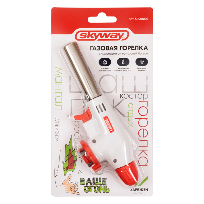 Горелка газовая SKYWAY на цанговый баллон с пьезоподжигом 1002 - предназначена для быстрого разжигания огня (уголь, дрова, щепа, трава), особенно в сырую погоду. Разогретая горелка дает ровный факел и стабильно работает при наклонах не более 40 градусов. Простая установка на газовый баллон.