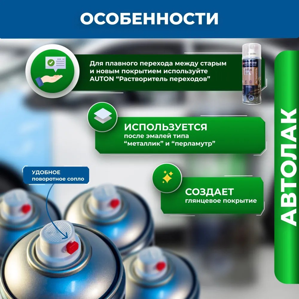Быстросохнущий бесцветный однокомпонентный акриловый лак ATN-A46029 в аэрозольной упаковке применяется в качестве финишного покрытия при ремонтной покраске деталей кузова автомобилей автоэмалями типа "металлик" и "перламутр", а также для придания декоративного блеска окрашенным и неокрашенным поверхностям из дерева, металла, стекла, камня и различных видов пластика. Предназначен для создания глянцевого защитного покрытия, стойкого к ультрафиолетовому излучению и механическому воздействию.