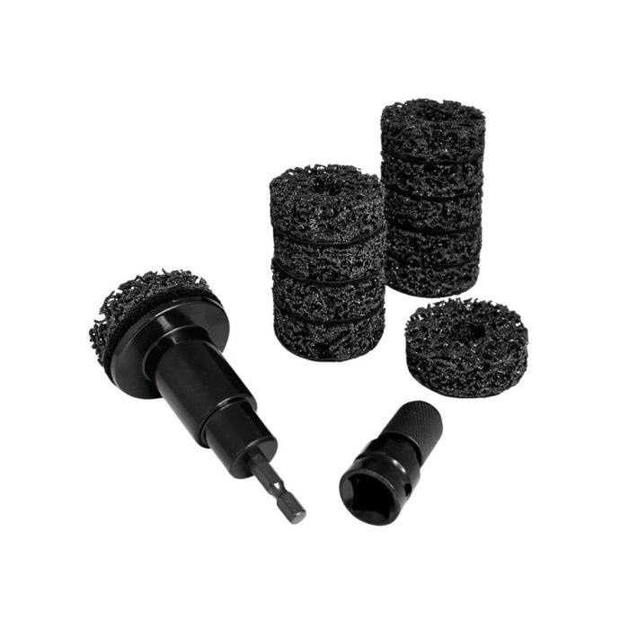 Предназначен для очистки грязи, ржавчины и других загрязнений колесных шпилек и болтов. Конструкция крепления на липучке для быстрой замены зачистных дисков.