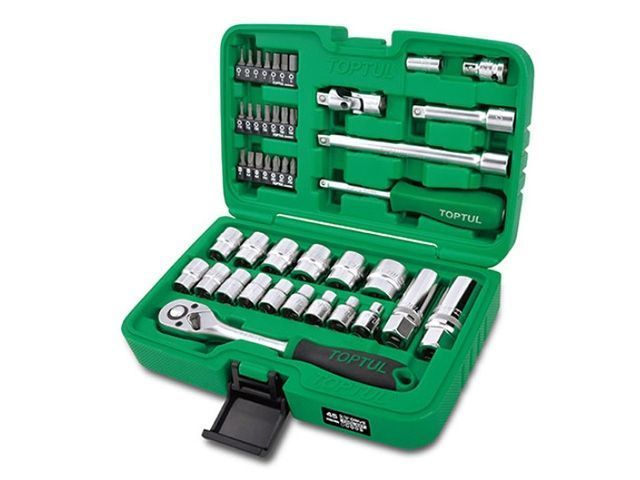 "Набор торцевых головок и бит 1/4"", 3/8"" TOPTUL состоит из 45 предметов. Рекомендуется для профессионального использования