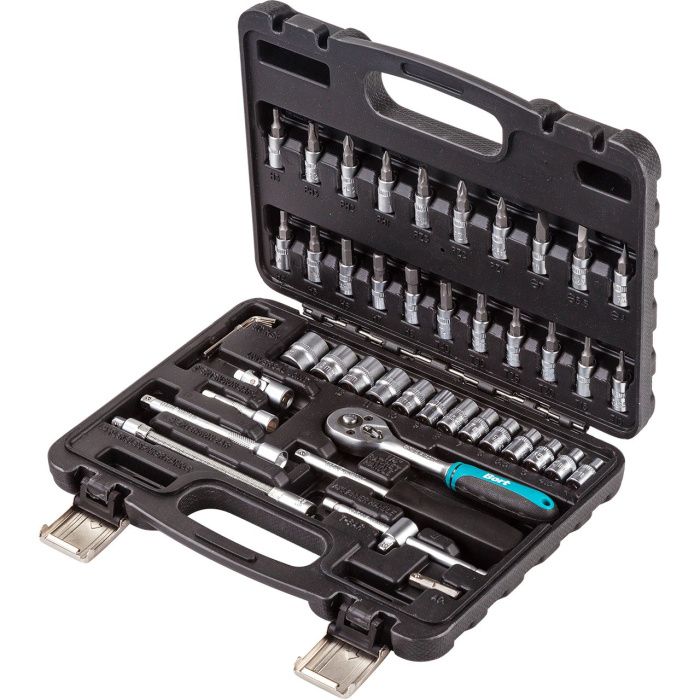Набор ручного инструмента BTK-46 благодаря своему наполнению решает множество задач. Используйте его для ремонтных, монтажных и демонтажных работ дома, на даче, в автомобиле. Комплект станет отличным подарком для любителей и профессионалов. Инструменты помещены в стильный легкий кейс для удобного хранения и транспортировки. Улучшенные петли и замки обеспечивают удобное применение в течение всего срока службы. Изделия выполнены из высококачественного металла для особой прочности. В комплект входят: головки 13 размеров, торцевые головки с аналогичным посадочным квадратом и со вставками-битами для различных видов крепежных материалов, отвертка для бит, трещоточный ключ на 72 зуба с возможностью быстрого сброса, шестигранный адаптер, удлинители в двух размерах, гибкий удлинитель для работы в труднодоступных местах, Т-образный вороток, шестигранный ключ в 4-х размерах и карданный шарнир. Посадочный размер инструментов из набора — ¼ дюйма, самый распространенный формат.