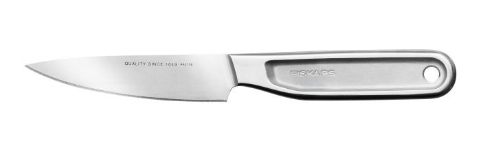 Нож для очистки овощей Fiskars All Steel 10 cm (1062887) идеально подходит для очистки и нарезки мелких фруктов и овощей. Ножи из линейки All Steel сочетают в себе материалы превосходного качества с непревзойденной функциональностью. Изготовлен из японской высокоуглеродистой стали для отличной производительности и долговечности. Оптимально сбалансирован для высочайшего качества резки. Отлит из цельного куска нержавеющей стали. Заточка рекомендуется с помощью точилки Fiskars Roll-Sharp™ или точильного камня.