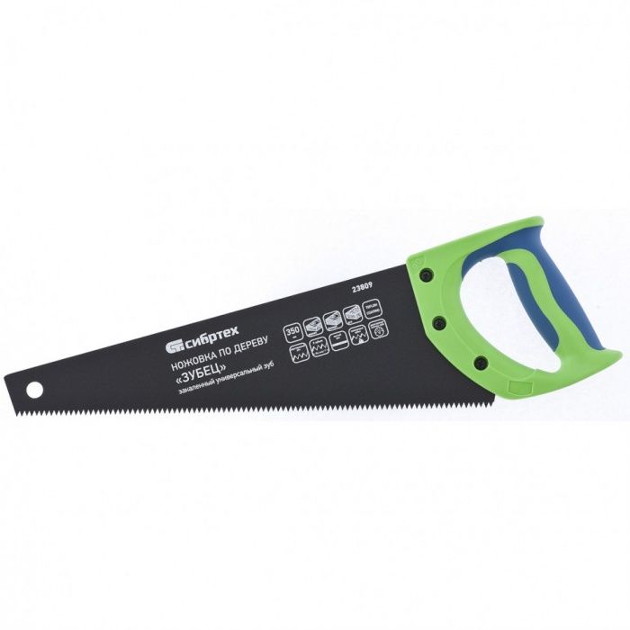 Ножовка по дереву "Зубец", 350 мм, 7-8 TPI, каленый зуб 2D, двухкомпонентная рукоятка Сибртех 23801, описание: