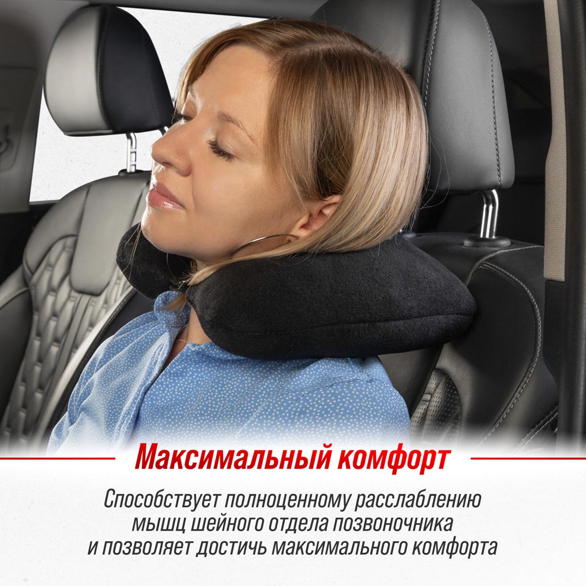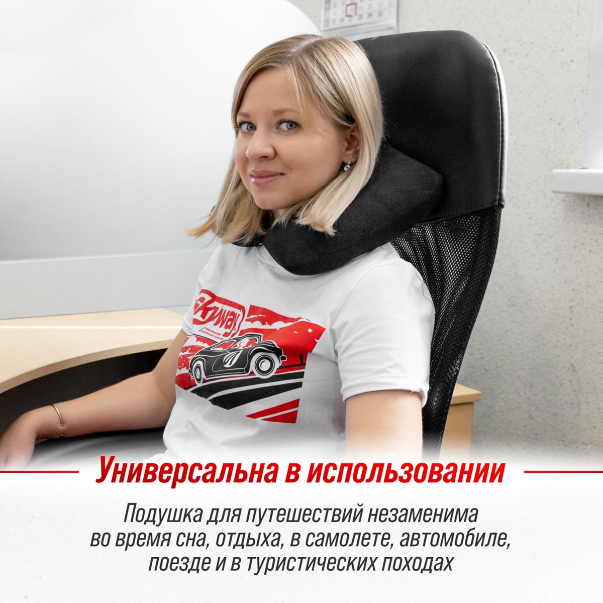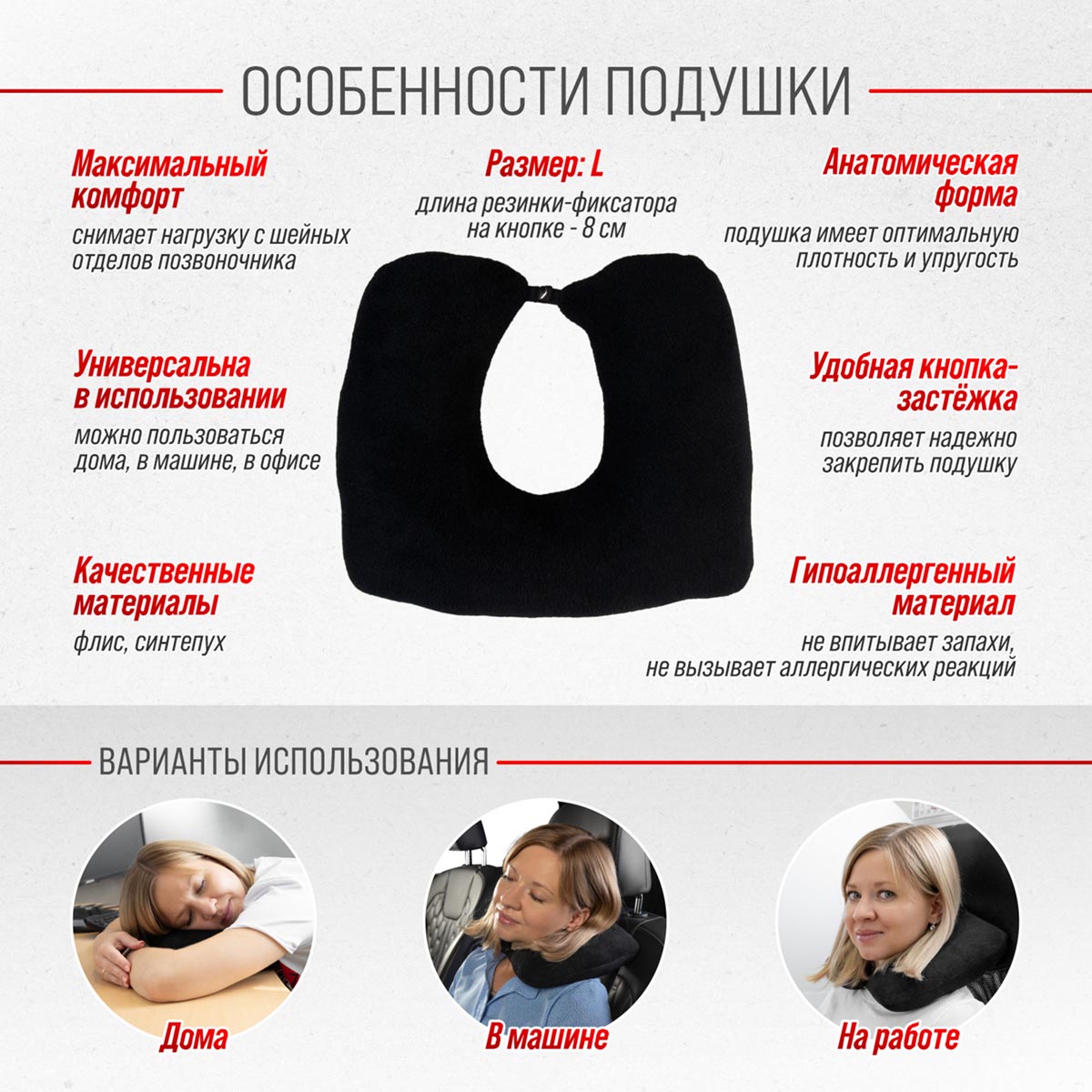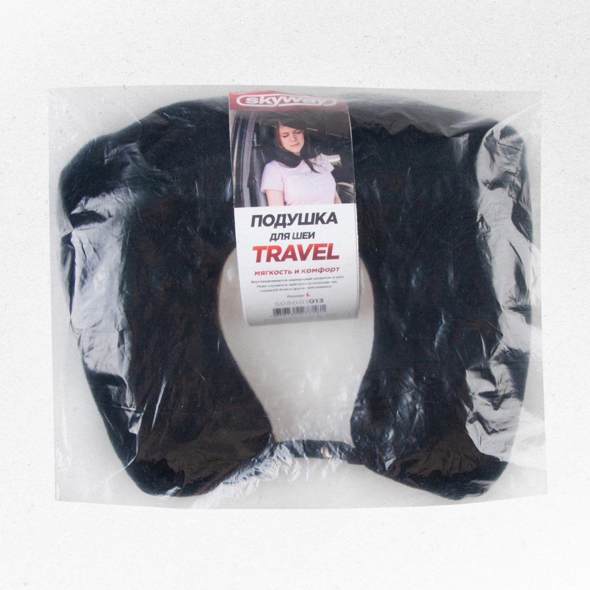 Подушка под шею SKYWAY Тревел L Черный - это незаменимая вещь при длительных поездках. Она помогает чувствовать комфорт и снимает усталость с шейных отделов позвоночника, а также обеспечивает правильное положение головы. Подушка фиксируется при помощи резинки на металлической кнопке.