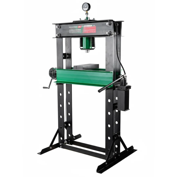 Гидравлический напольный пресс — это мощное и надежное профессиональное оборудование грузоподъемностью 40 тонн, предназначенное для выполнения различных слесарных и ремонтных работ. Отверстия стоек позволяют с легкостью менять высоту стола, обеспечивая рабочий диапазон высоты от 45 мм до 945 мм при ширине между стойками 645 мм, что позволяет работать с деталями различных габаритов. Ход штока составляет 160 мм, обеспечивая достаточную амплитуду движения для выполнения большинства прессовочных операций. Пресс оснащен стрелочным манометром для точного контроля давления и системой безопасности с предохранительным клапаном. Пресс идеально подходит для использования в автомастерских и на промышленных предприятиях для работы с тяжелыми деталями и материалами. Устойчивое положение пресса обеспечивается прочной конструкцией рамы, а его использование требует строгого соблюдения мер предосторожности и применения только по назначению на твердой и ровной поверхности.