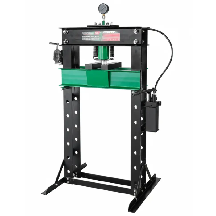 Гидравлический напольный пресс — это мощное и надежное профессиональное оборудование грузоподъемностью 50 тонн, предназначенное для выполнения различных слесарных и ремонтных работ. Отверстия стоек позволяют с легкостью менять высоту стола, обеспечивая рабочий диапазон высоты от 45 мм до 945 мм при ширине между стойками 645 мм, что позволяет работать с деталями различных габаритов. Ход штока составляет 160 мм, обеспечивая достаточную амплитуду движения для выполнения большинства прессовочных операций. Пресс оснащен стрелочным манометром для точного контроля давления и системой безопасности с предохранительным клапаном. Пресс идеально подходит для использования в автомастерских и на промышленных предприятиях для работы с тяжелыми деталями и материалами. Устойчивое положение пресса обеспечивается прочной конструкцией рамы, а его использование требует строгого соблюдения мер предосторожности и применения только по назначению на твердой и ровной поверхности.