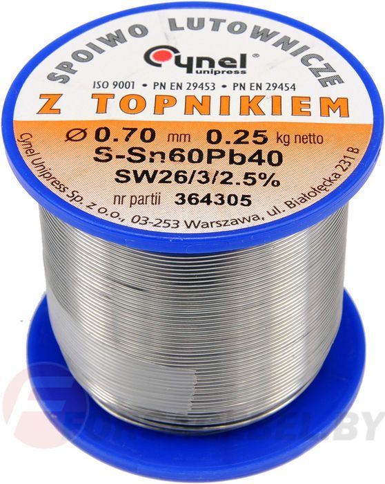 Связующее для припоя с флюсом, полученным при первой плавке олова и свинца в соответствии с PN EN 29453: 2000, в процессе непрерывной разливки без доступа воздуха, затем экструдированного, который обеспечивает удаление оксидов. Связующее имеет толщину 0,5 мм и весит 100 г, с содержанием олова от 59,5 до 60,5% и температурой плавления от 183 до 190° С. Флюс SW26 изготовлен на основе канифоли и активатора органического галогена, который после пайки «связывается» с канифолью, что предотвращает прямой контакт с припоем и не вызывает коррозию, а также способствует плавлению и увеличивает текучесть припоя. Припой связующий в основном используется в электронной промышленности, для производства стандартных устройств и электронных компонентов, а также в электротехнике. Поместить в удобный флакон.