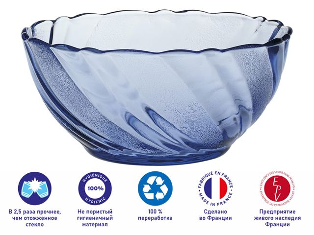 Салатник Beau Rivage из сверхпрочного закаленного стекла от ТМ Duralex - надежный помощник в приготовлении любимых рецептов. Нежно-голубой цвет стекла будет радовать глаз и придаст ощущения свежести и легкости сервировке стола. Ударопрочное стекло обеспечивает привлекательный внешний вид и устойчиво к появлению царапин. Салатники компактны в хранении и экономят место на кухне, ведь их удобно штабелировать. Стеклянная посуда ТМ Duralex производится во Франции с 1945 года. Процесс закаливания придает стеклу ТМ Duralex особую прочность. Во время закаливания стекло ТМ Duralex , предварительно нагретое до 700°С, подвергается резкому охлаждению холодным воздухом. Этот процесс делает стекло ТМ Duralex в 2,5 раза более устойчивым к механическим повреждениям, чем отожженное стекло. Характеристики: ударопрочное закаленное стекло, термостойкость до 130 ° C (EN 1183), можно мыть в посудомоечной машине, подходит для использования в микроволновой печи.