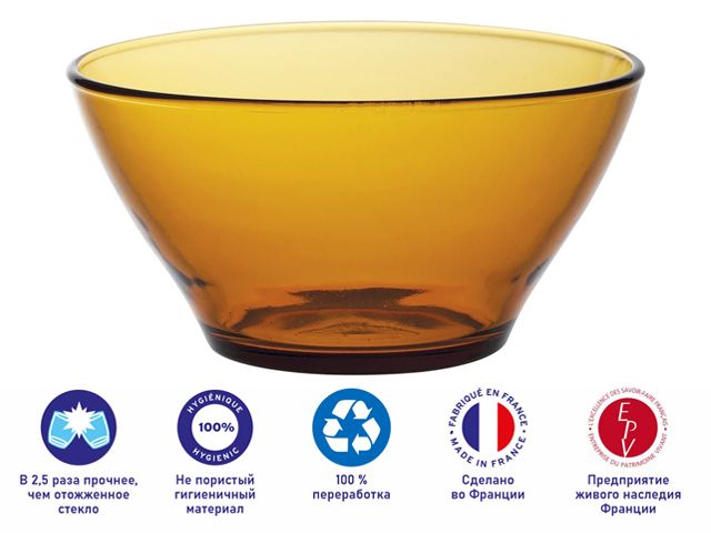 Салатник Lys из сверхпрочного закаленного стекла от ТМ Duralex - надежный помощник в приготовлении любимых рецептов. Благородный янтарный цвет стекла добавит изюминку и оригинальность сервировке. Ударопрочное стекло обеспечивает привлекательный внешний вид и устойчиво к появлению царапин. Салатники компактны в хранении и экономят место на кухне, ведь их удобно штабелировать. Стеклянная посуда ТМ Duralex производится во Франции с 1945 года. Процесс закаливания придает стеклу ТМ Duralex особую прочность. Во время закаливания стекло ТМ Duralex , предварительно нагретое до 700С, подвергается резкому охлаждению холодным воздухом. Этот процесс делает стекло ТМ Duralex в 2,5 раза более устойчивым к механическим повреждениям, чем отожженное стекло. Характеристики: ударопрочное закаленное стекло, термостойкость до 130 C (EN 1183), можно мыть в посудомоечной машине, подходит для использования в микроволновой печи.