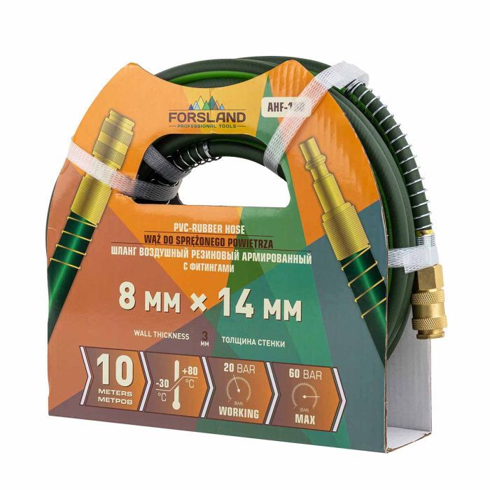 Шланг для компрессора резиновый воздушный армированный с фитингами 8 мм x 14 мм 10 м используется для подключения пневмоинструмента к компрессору при работе с сжатым воздухом. Воздушный шланг произведен из армированной резины, устойчивой к изнашиванию. Полимерная оболочка выдерживает многократное применение без разрывов, за счет чего обеспечиваются герметичность и длительная эксплуатация. Пневмошланг высокого давления оснащен дополнительной защитой в виде стальных пружин, которые предотвращают изламывание шланга в местах крепления, внутренний диаметр 8 мм и внешний диаметр 14 мм. Также благодаря армированию изделие выдерживает высокие нагрузки по давлению сжатого воздуха до 65 бар, рабочее давление 22 бар. Толщина стенки шланга составляет 3 мм, что придает ему высокую механическую прочность и долговечность. Быстросъемы изготовлены из латуни, устойчивые к коррозии и деформации. Соединение муфт обеспечивает удобство и долговечность эксплуатации. Область фиксации креплений усилена, что позволяет избежать перегибов и изломов. Шланг может храниться и эксплуатироваться при температурах от -35 до +75 градусов Цельсия.