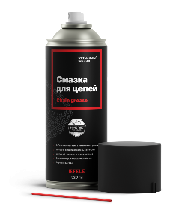 Упаковка смазки для цепей EFELE в форме аэрозоля (520 мл) позволяет легко и быстро наносить материал на поверхности. Съемная трубочка-насадка позволяет наносить смазку точечно и более экономично.
