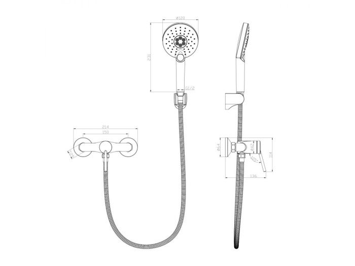 --- Технологические характеристики: Коллекция: Minima Цвет: хром Материал корпуса: латунь Ширина смесителя,см: 21,4 Глубина смесителя, см: 13,6 Высота смесителя, см: 11,4 Излив выдвижной: нет Излив поворотный: нет Длина излива, см: 0 Высота излива, см: 0 Тип монтажа: на стену Гарантия: 4 года Бесплатное сервисное обслуживание: 10 лет --- Комплектация: 3-функциональная лейка ?120x240 мм Настенное поворотное крепление для лейки Душевой шланг 1,5 м Присоединительная группа для настенного крепления Металлическая рукоятка ---