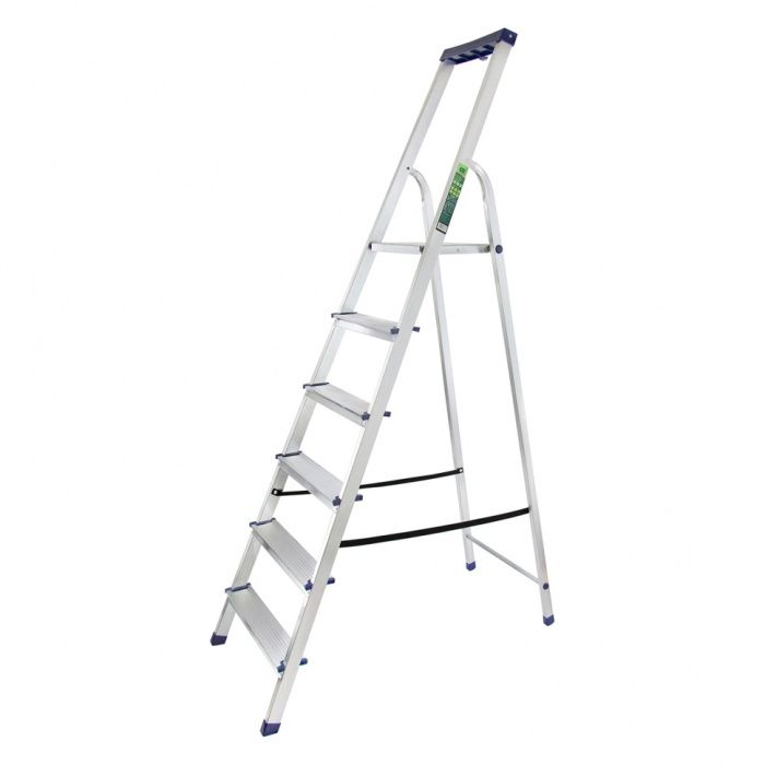Стремянка алюминиевая Сибртех «Универсал» 97896 с 6 ступенями — складная лестница для отделочных и монтажных работ на высоте, превышающей человеческий рост. Площадка находится на высоте 124,5 см от опорной поверхности, рабочая высота стремянки составляет 324,5 см (при среднем росте пользователя 170 см). Высокая дуга обеспечивает безопасность пользователя. Стремянка удобна для длительной работы, используется во время строительства и ремонта, а также в быту.