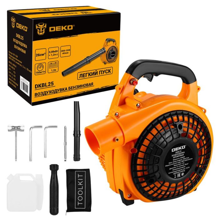 - Воздуходувка бензиновая DEKO DKBL25 — это ручной садовый инструмент, предназначенный для эффективной уборки территории, удаления листвы, мелкого мусора, остатков после мангала, а также очистки от пыли и загрязнений с поверхностей автомобиля, машины, элементов ПК, компьютера и различной техники. Благодаря высокой производительности, модель применяется при работе в условиях сада, дачи или частного участка.